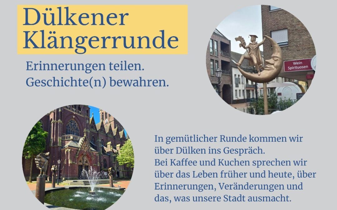 Auf Initiative des Dülkener Verkehrs- und Verschönerungsvereins findet am 10.03.2026 erstmals die „Dülkener Klängerrunde“ im DülkenBüro statt. Bei einer Tasse Kaffee und einem Stück Kuchen wollen wir dabei Menschen zusammen bringen, die Lust haben, ihre Erinnerungen an Dülken mit anderen zu teilen und ihre Geschichte(n) erzählen wollen. Wir wollen über das Leben von früher und heute sprechen, über Erinnerungen, Veränderungen und das, was unseren Stadtteil ausmacht.