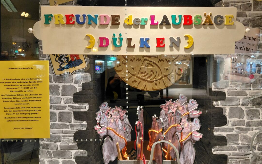 11 Steckenpferde sind wieder bereit, sich gegen eine großzügige Spende einen neuen Besitzer zu suchen, um mit ihm am 11.11.2025 um die Narrenmühle zu reiten. Die Volksbank Viersen, die „Freunde der Laubsäge Dülken“ und Axel Schriefers haben diese Idee Wirklichkeit werden lassen. Das gespendete Geld wird der Jugendabteilung der KG die Üule e.V. zur Verfügung gestellt.